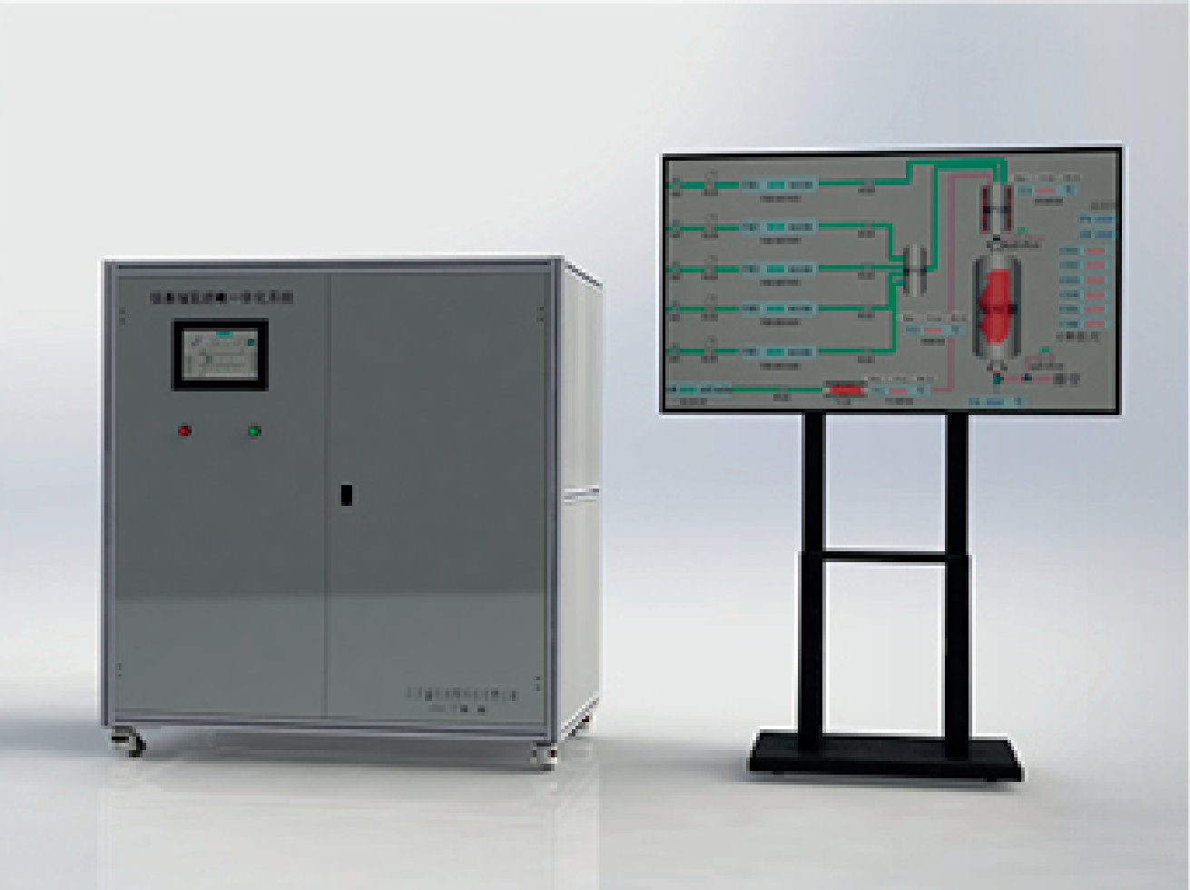 系统包含储氢单元、加热单元、流量控制单元、测量单元、充气单元、燃料电池电堆、软件控制单元等部分。储单元为燃料电池提供气源,辅助加热单元为镁基储氢单元放氢供热,燃料电池发电后,通过 DC单元稳定电压,经逆变器输出AC220V交流电,电堆最大输出功率 1kw